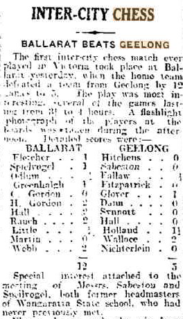 The first intercity Chess match ever played in Victoria took place in Ballarat yesterday, when the home team defeated a team from Geelong by 12 points to 5. The play was most interesting. Several of the games lasted from 3 to 4 hours. A flashlight photograph of the players at the boards was made during the afternoon. Special interest attached to the meeting of Messrs Sabeston and Spielvogel, both former headmasters of Wangaratta Stae School, who had never previously met.