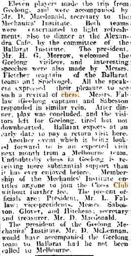 Eleven players made the trip from Geelong, and were accompanied by Mr. D.MacDonald, secretary to the Mechanics Institute (of Geelong). Both teams were entertained to light refreshments, also to dinner at the Alexandra Cafe, by the Ballarat Institute. The President, Mr H.G.Morrow, welcomed the Geelong visitors, and interesting speeches were also made by Messrs. Fletcher, captain of the Ballarat team, and Spielvogel. All the speakers expressed their pleasure to see such a revival of chess. Messrs.Fallaw (Geelong captain) and Sabeston responded in similar vein. After dinner, play was concluded and the visitors left for Geelong, tired but not downhearted. Ballarat expects at an early date to play a return visit here (in Geelong). Another event which is being looked forward to is an expected visit next month from a Melbourne team. Undoubtedly, chess in Geelong is receiving more substantial support than it has ever enjoyed before. Membership of the Mechanics Institute entitles anyone to join the Chess Club without further fee. The present officials are: President, Mr.L.Fallaw; vice-presidents, Messrs Sebaston, Glover and Hitchens; secretary, and treasurer Mr. D.Macdonald. The president of the Geelong Mechanics Institute, Mr.D.MacLennon, would have accompanied the Geelong to Ballarat had he not been called to Melbourne.