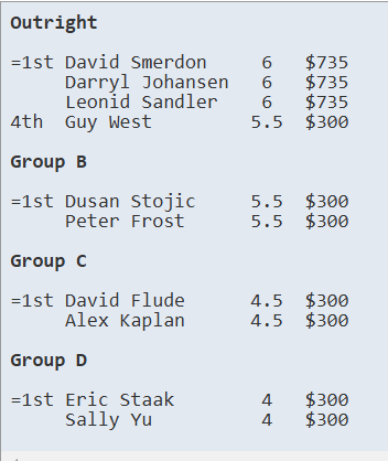 1 David SMERDON VIC 2456 A 6 36 : W 20 : W 10 : W 18 : W 9 : W 3 : L 14 : W