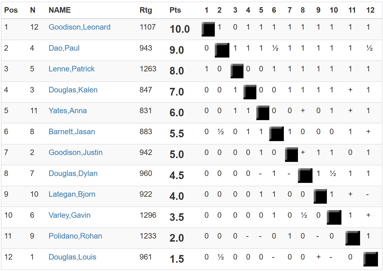 So, after a hard fought, very strong 2020 Championship tournament, James Watson and Scott Stewart finished tied on 9.5/11, and a play-off is now needed to decide who is 2020 Club Champion! Stay tuned.