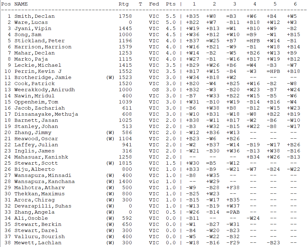 38 players participated in the second rapid tournament with a 15 minute and 5 second increment. After the dust settled in the second week, Scott Stewart emerged victorious with a perfect score of 6 points, followed by Declan Smith on 5, and Peter and Harrison a further 1/2 point behind.