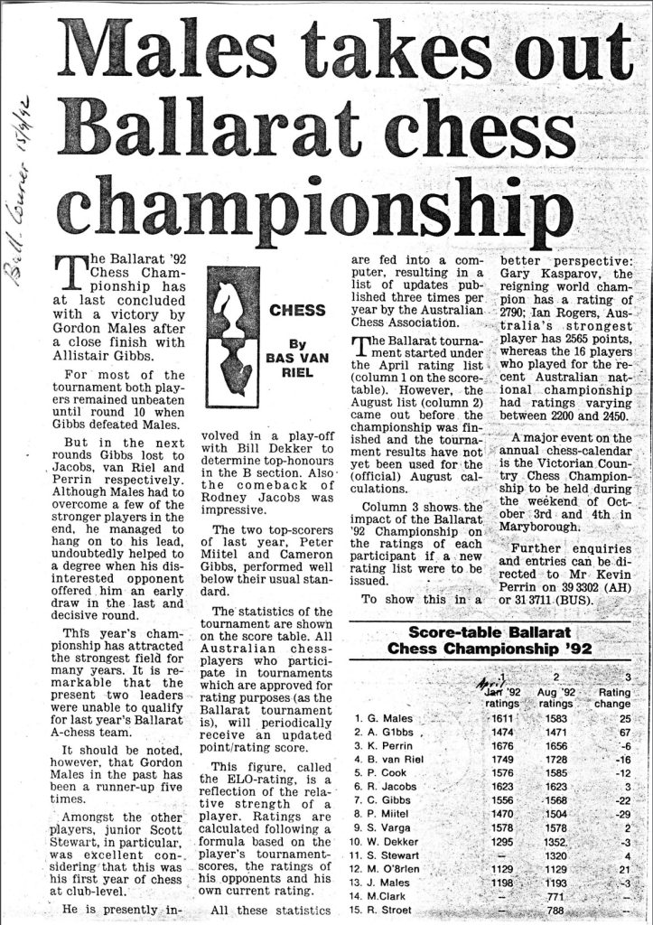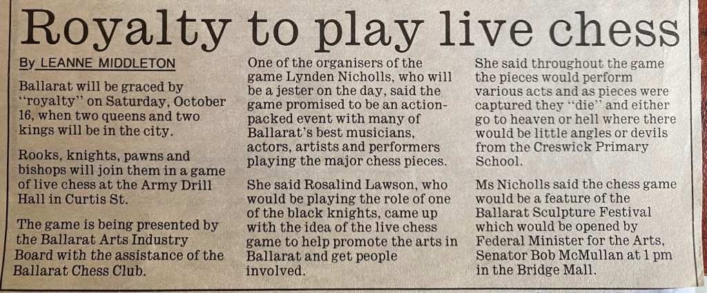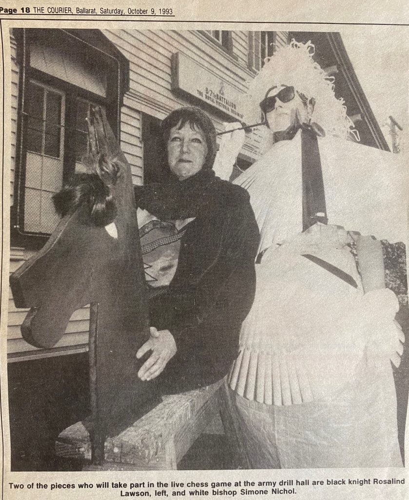 Although it is difficult to see their faces in this Courier article, the standard bearers were Kevin Perrin, Rod Jacobs, Andy Miitel, and Gordon Males, in their youth! Kevin and Rod are still active in the Ballarat Chess Club in 2025.
