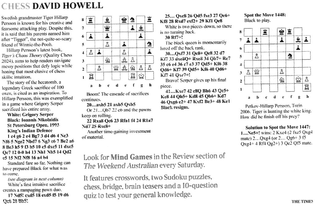 Kevin Perrin recently found this game, featured in David Howell’s The Times chess column, in his archives and played through it because he recognised the name ‘Grigory Serper’ as a player at the World Junior championship held in Adelaide in 1988 for which he was the chief arbiter. That event included household names such as Gelfand, Ivanchuk, Akopian, Adams, Polgar and many other future stars, but it was won by Joel Lautier from France. It was one of his most rewarding chess experiences.