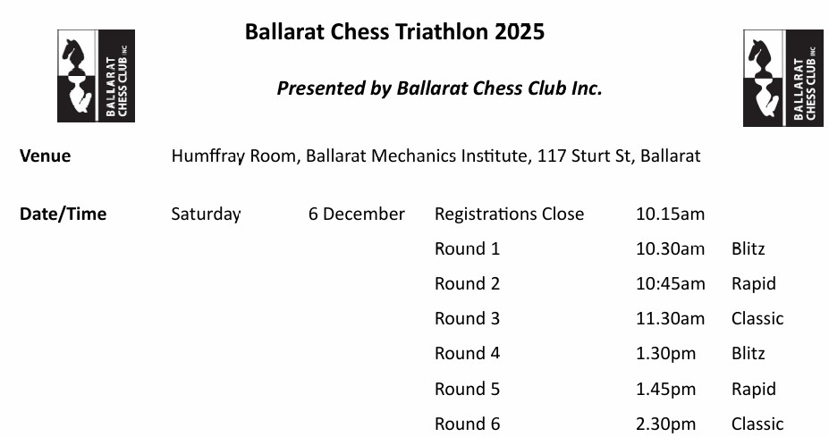 We are pleased to advise that the 2025 Victorian Country Chess Championship will be held in Bendigo over the weekend of 11th and 12th October.