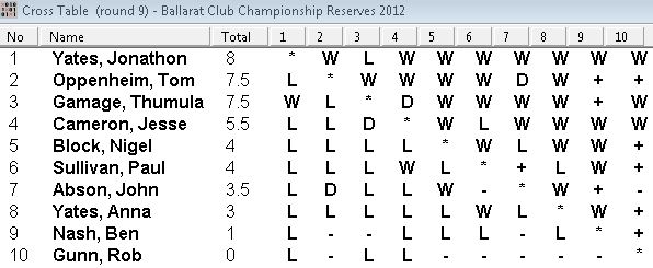 The 2012 Ballarat Chess Club championships, the 47th, attracted a field of 19 players, split into 2 tournaments. The ‘A’ grade, for the Andy Miitel Memorial shield has 9 players.