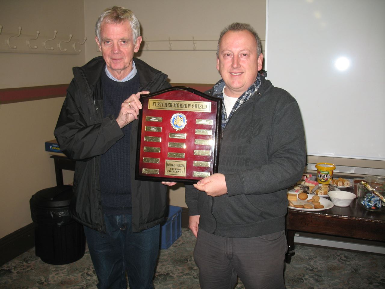 In 2011 we hosted Geelong Chess Club for Round 5 of the Victorian teams tournament, and at the suggestion of Geelong President Ben Kersten, a match of 10 boards, in the spirit of the famous 1925 and 1926 matches, was arranged, with the top 4 boards counting for the teams competition. Before play commenced, we were presented with a copy of Andrew Wemyss’ splendid history of Geelong Chess Club. The original Ballarat Geelong tournaments were held at the Mechanics' Institute. The revived tourney is being held annually and the teams vie for inscribing their name on the new Fletcher Morrow Shield, donated by Bill Stokie.