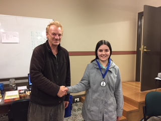 Round 6, the final round, changed everything: Jamie got a draw with Rod, finishing with 5 out of 6 points, in reach of James who needed a win against Harrison to get into a play-off. James resigned after an inaccurate bishop move gave the game away, leaving Jamie the winner. Caitlin and Dan finished on 3 and had to play 2 games of blitz to decide the winner. Caitlin won both, earning her the Reserves medal.