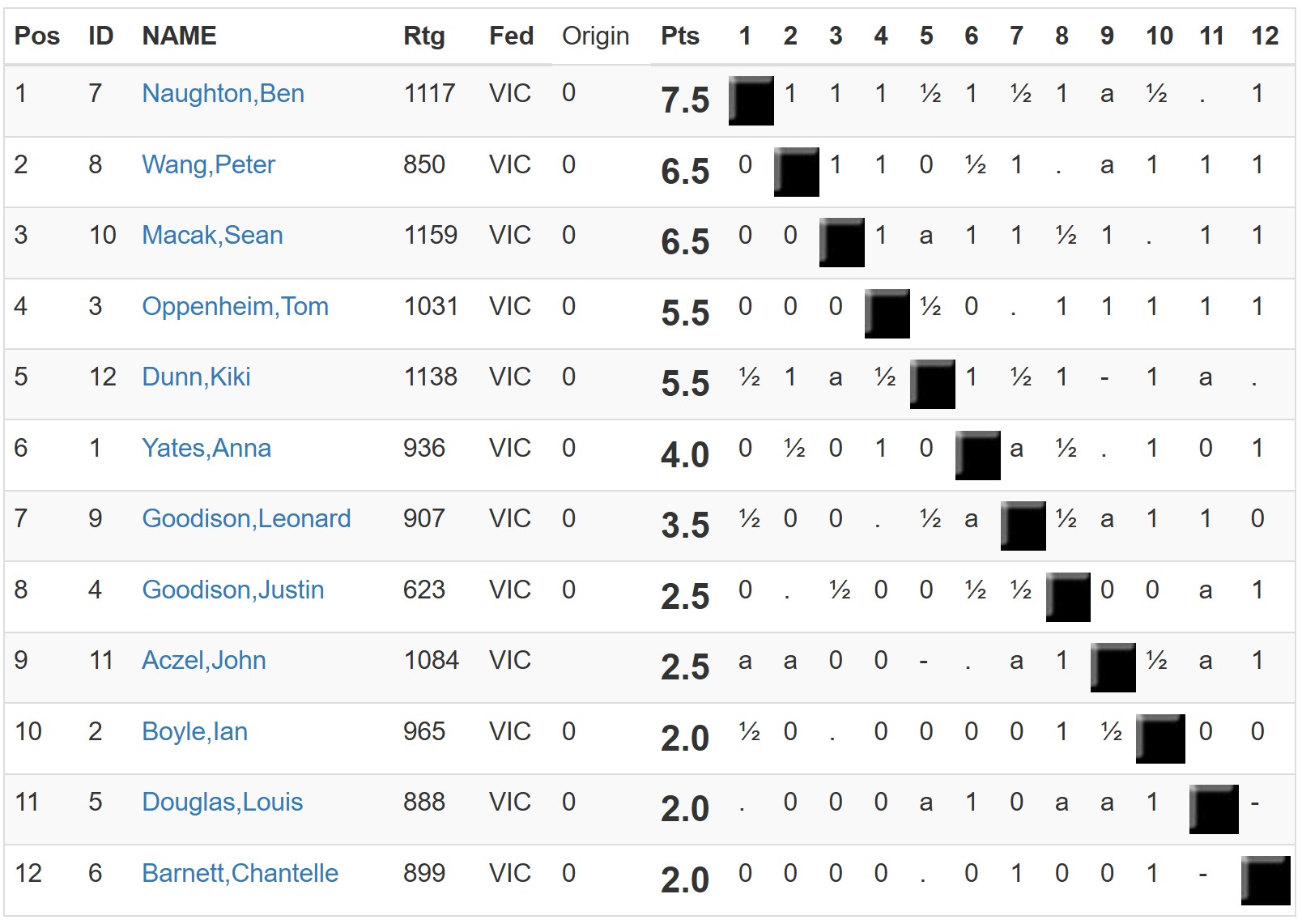 Ruari Coffey finished 2nd with 8/11, but might consider himself unfortunate not to be Champion himself after âgoing off the boilâ towards the end. Patrick Cook and Harrison Harrison finished joint 3rd with 7/11.