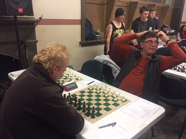 Only 3 games in the Championship were played on the night. Cassandra Barnett met Harrison Harrison who defended with an almost conventional Old Indian. In a positional game, Cassandra could make no headway against Harrison's strong play and Black went on to win comfortably.Caitlin Barnett fared better against Peter Miitel in a Benoni-like structure, maintaining material equality until a draw was agreed after 18 moves. White may even have had an edge at the end.