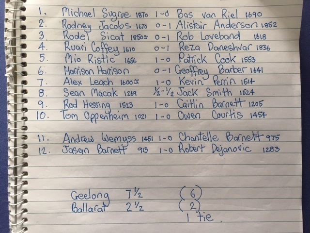 Board 6 Harrison Harrison 1634 (Ballarat) – Geoffrey Barber 1641 (Geelong) 0-1