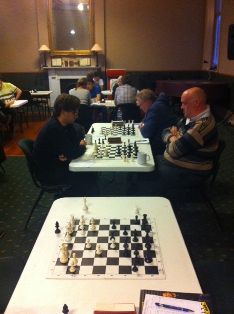 Above, Patrick half way through his game, on move 3, and Peter W plays Ruari. Leonard and Chantelle on a busy table.