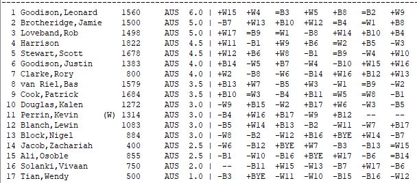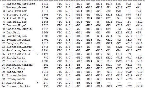 There was a definite show of support for the first Sunday Allegro Chess Tournament held at the BMI on Sunday afternoon - 24 participants and their families came from as far afield as Melbourne and Bendigo. Jasan Barnett directed play and the tournament ran smoothly, finishing at around 5:30 p.m. The time control seemed to suit some more than others; time must be carefully managed as the two second increment is barely enough to make a move and hit the clock when players are down to the last seconds of the game. So, players who can read the board quickly in any position do well - Harrison, known for his unusual openings, showed his skill at playing wild positions under time pressure, winning all six of his first games, coming unstuck only on the last, defeated by James Watson. The field was split into 3 groups, each group having a prize winner. Harrison was overall winner, followed by James as first in the top group, Patrick Cook in the second, and Nigel Block taking the third group prize.