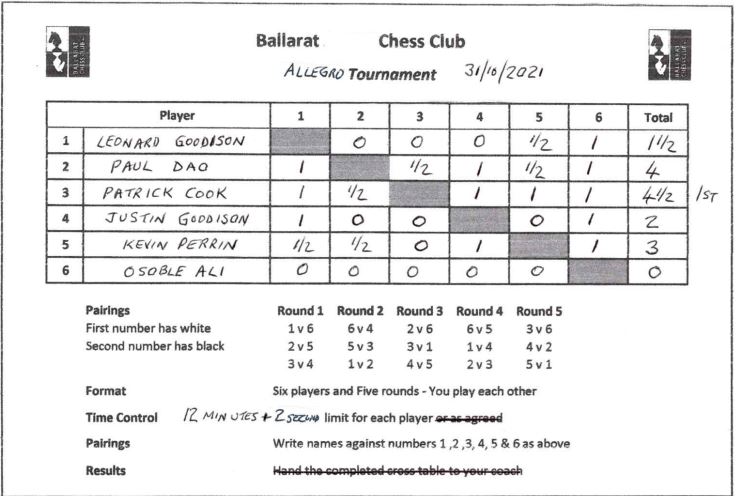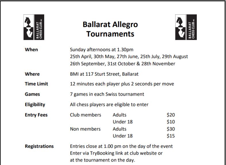 The fourth event of the 2021 series of Ballarat Allegro Tournaments will be held at 1.30pm on Sunday 25th July in the Humffray Room at the BMI 117 Sturt Street Ballarat. Further tournaments will be held on the final Sunday of each month of the year except for December. The tournament details are here.