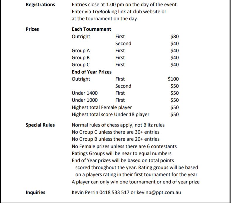 All chess players are invited to play in any single event. If you play in more than one tournament there are special end of year prizes as well. There is a small entry fee to cover prizes and operating expenses. You do not have to be a member of the Ballarat Chess Club to play, but there are reduced entry fees for members. You can enter online via TryBooking above or registrations will be accepted on the day by no later than 1.00pm at the BMI.