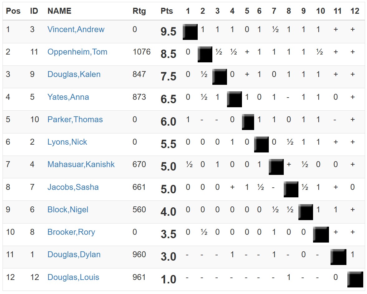 In the Reserves, the contenders, Andrew Vincent and Anna Yates both won, while Nick Lyons was held to a draw. The title is still up for grabs!