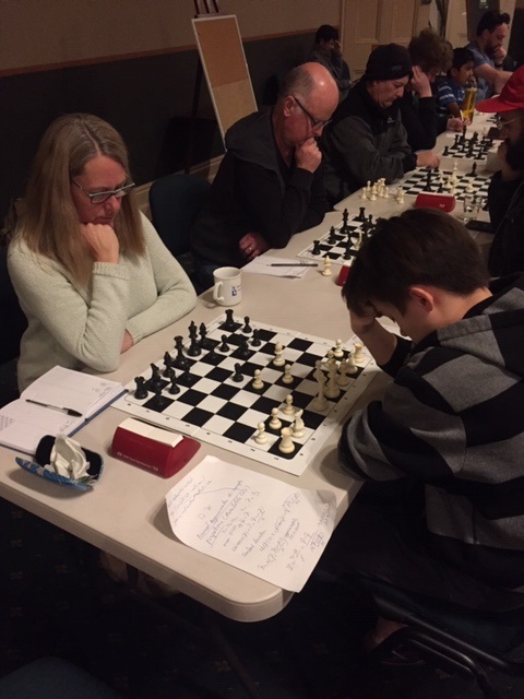 Jules Feinberg versus Patrick Cook was an English Opening. Jules played well and seized the initiative in the early middle game, prompting Patrick to lash out with a temporary piece sacrifice. Jules declined it, and the game reached a seemingly equal position. Patrick saw more and remarkably quickly gained a decisive advantage in the endgame and had no trouble converting.