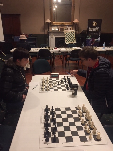 Ruari Coffey and Patrick Cook had the bye and so they took the opportunity to play their postponed Round 6 game. It was an important game, since Ruari just needed a draw in this, or his other postponed game against Paul Dao, to win the title! Predictably enough, the âdrawmeisterâ offered the Champion-in-waiting a draw after just 12 moves of a French, which Ruari happily accepted to assure himself of his first Ballarat Championship title!