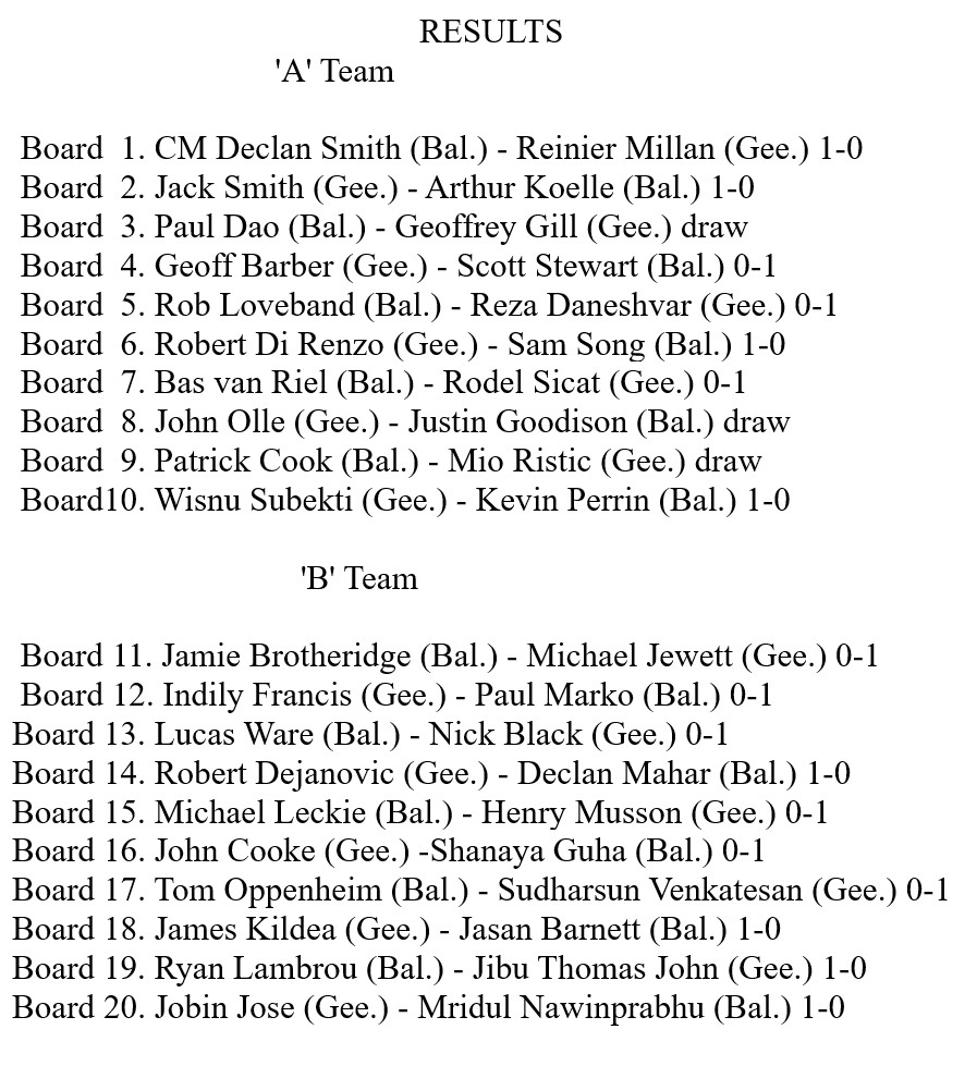 Thanks go to the team Captains, Patrick Cook for Ballarat, and Jack Smith for Geelong, for gathering so many players, the Ballarat Mechanics Institute for coming to the party, Kevin Perrin for liaising with the BMI, and the players themselves who contributed mightily to an enjoyable day of chess.